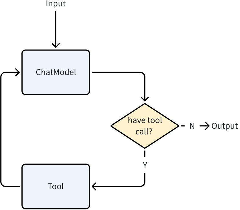 • It sends the tool result back to ChatModel (Observation), then starts a new loop until the model decides no tool is needed and stops