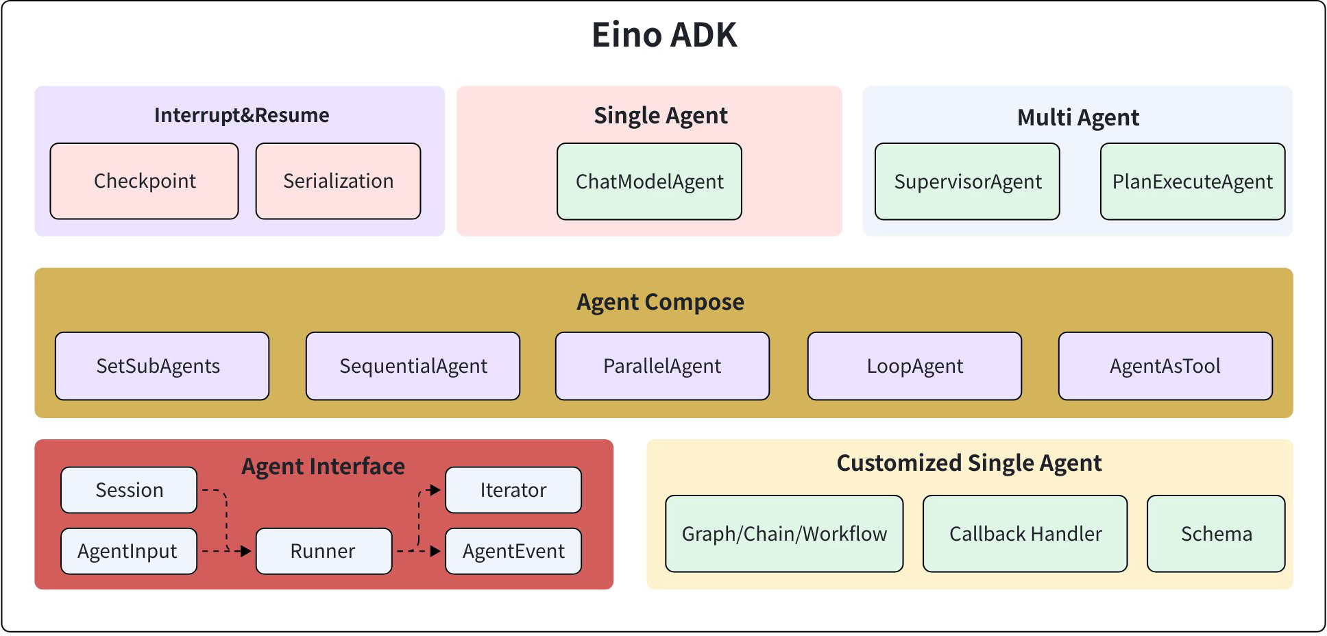 The core of ADK is the Agent abstraction. See the full details in Eino ADK: Agent Interface.