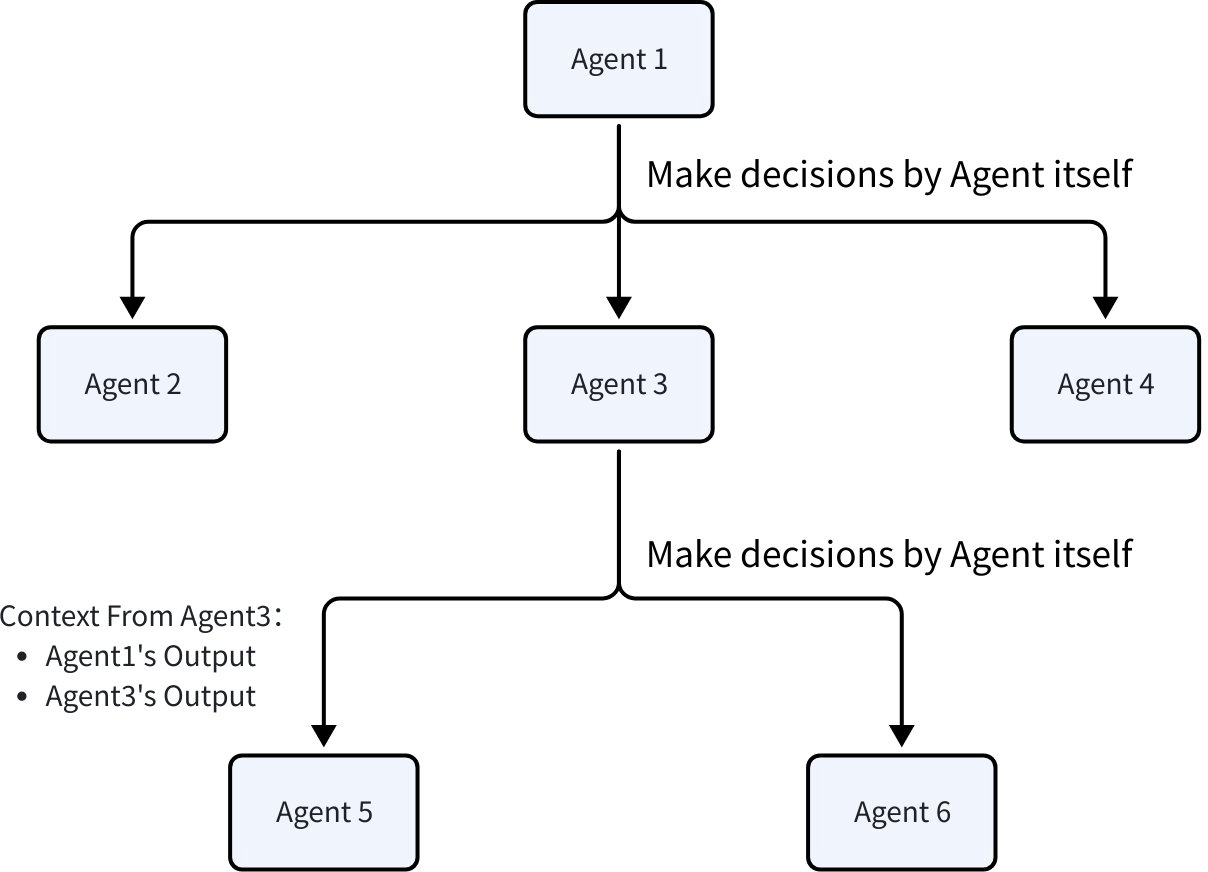 AutonomousInside the Agent, choose downstream Agents as needed (often via LLM). Even if decisions are based on preset logic, from the outside this is treated as autonomous.