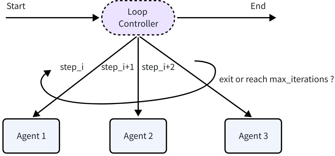 LoopCompose SubAgents to run in array order, repeat cyclically. Name/Description identify the Loop Agent. Executes subagents in sequence per loop.TransferUpstream full dialoguePreset
