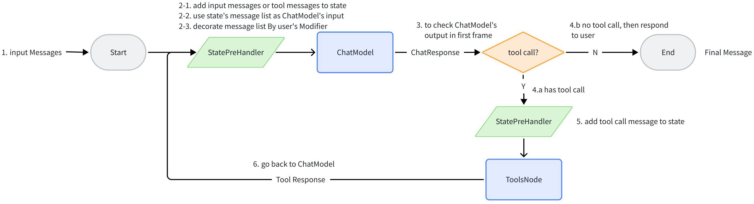 Under the hood, ReAct Agent uses compose.Graph. Typically two nodes: ChatModel and Tools. All historical messages are stored in state. Before passing history to ChatModel, messages are copied and processed by MessageModifier. When ChatModel returns without any tool call, the final message is returned.