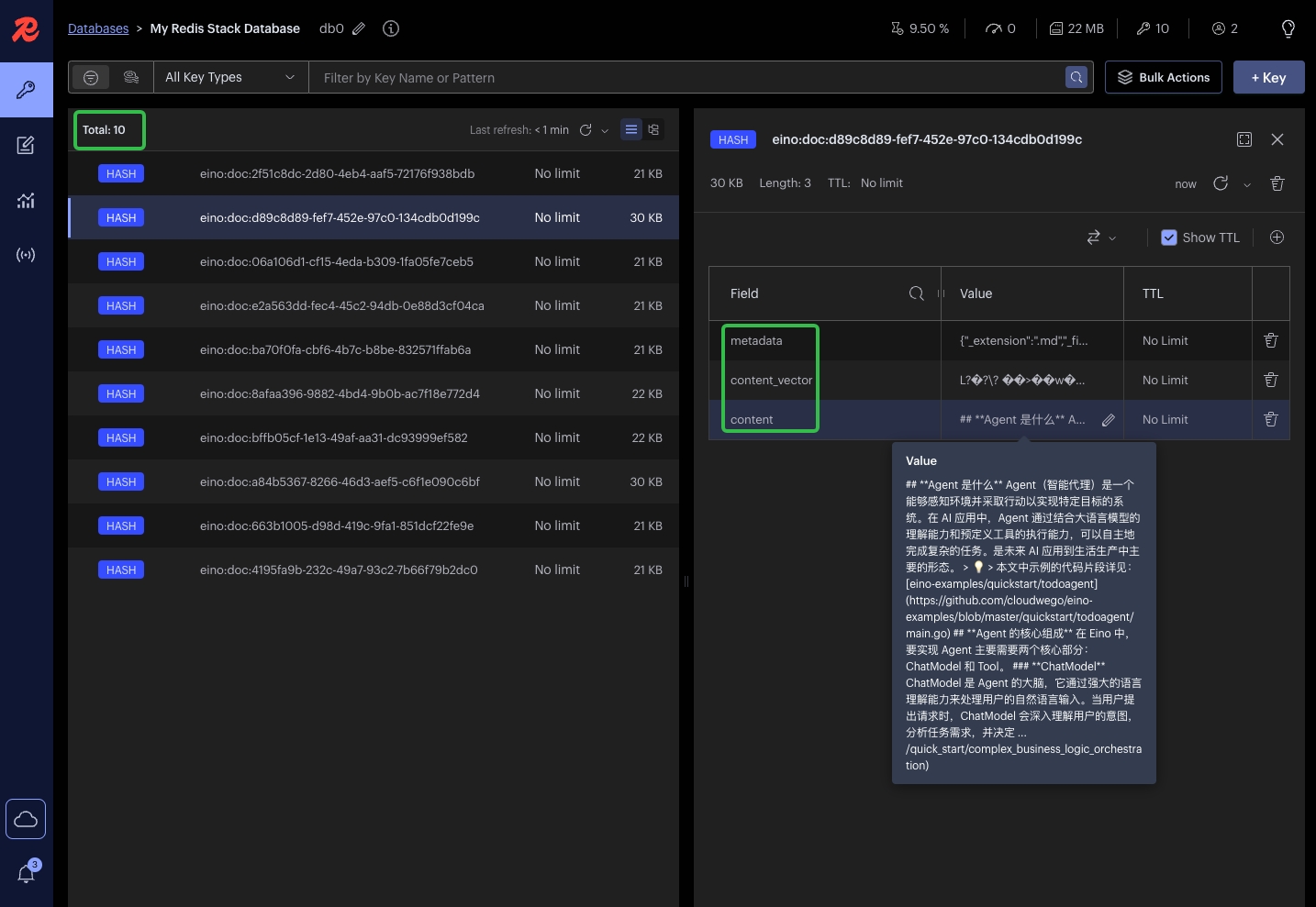 The sample already ships with part of the Eino docs pre-indexed in Redis.