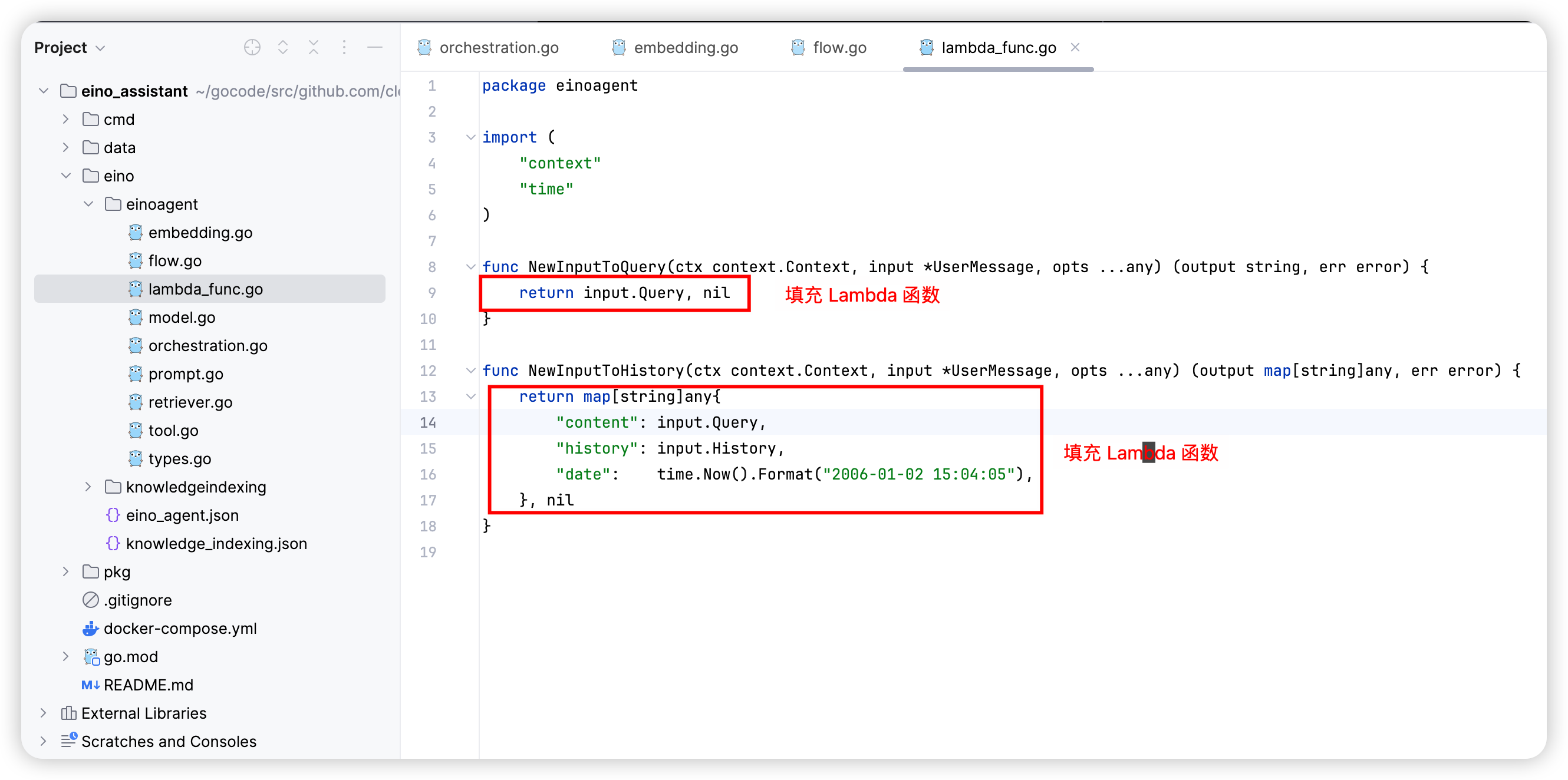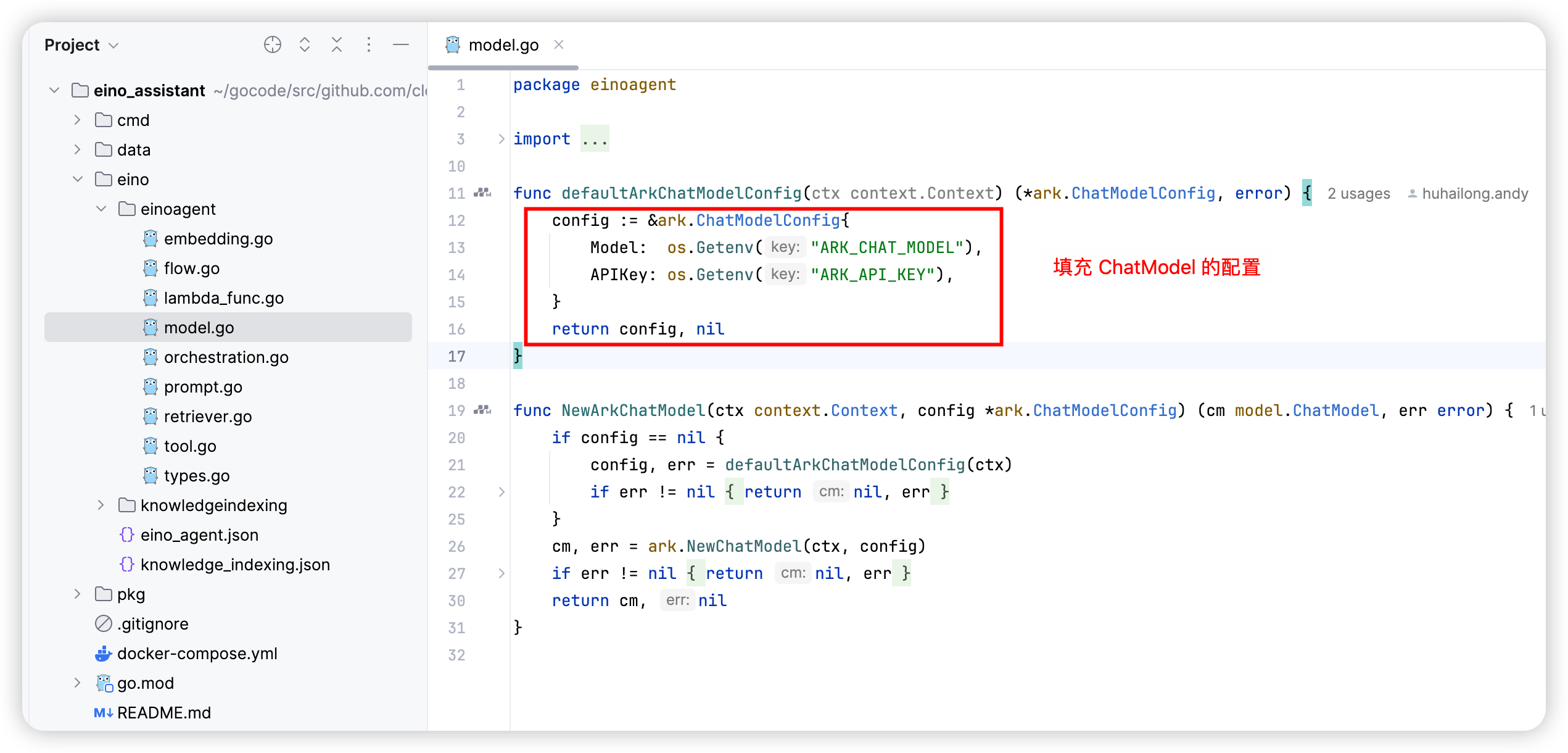 3. Generate code to eino/einoagent; you can copy from eino/eino_agent.json