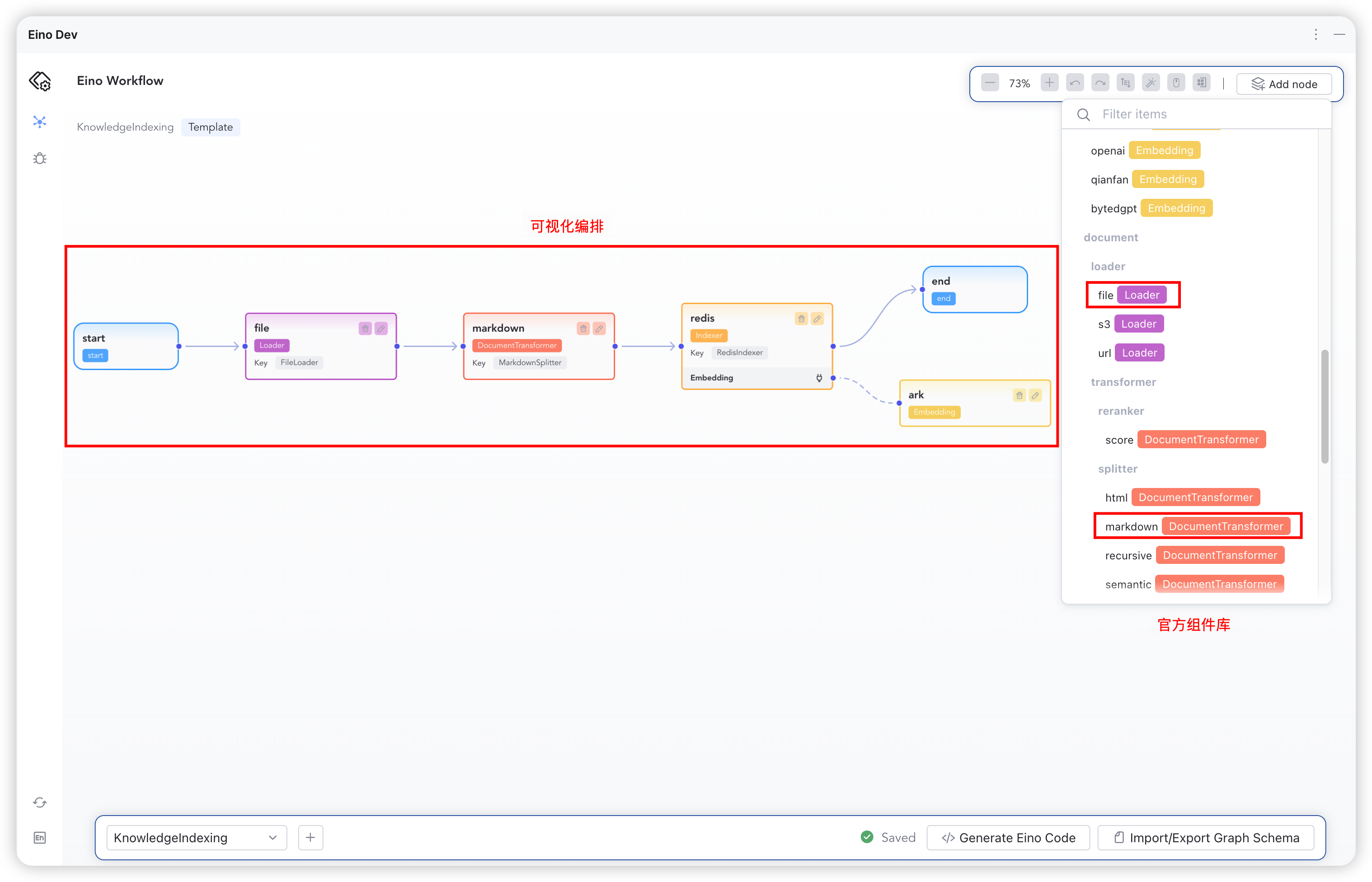 Visual orchestration lowers the learning curve and speeds up development. Experienced users can skip and build directly with Eino APIs.