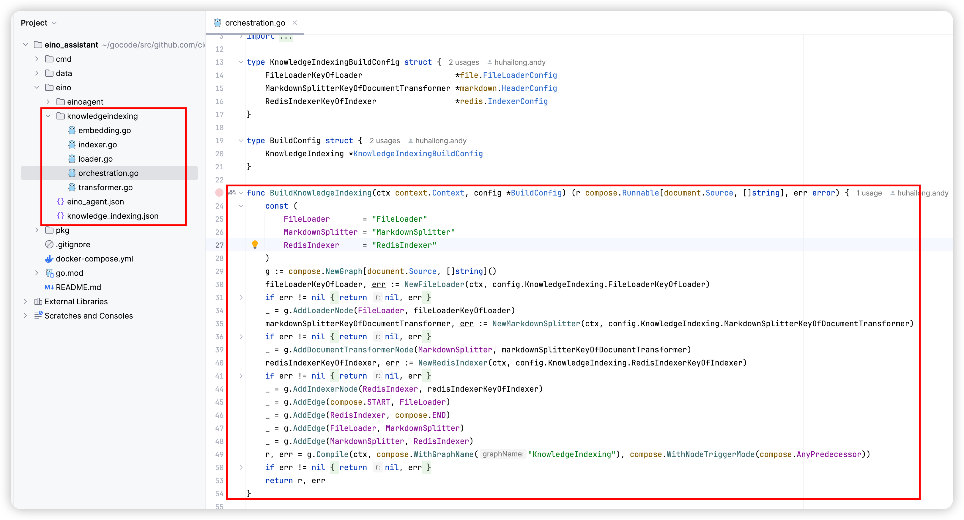 Use EinoDev (GoLand/VS Code) to visually compose the core workflow, then generate code into eino_assistant/eino/knowledgeindexing. After generation, complete the constructors for each component and call BuildKnowledgeIndexing in your business code to build and use the Eino Graph instance.